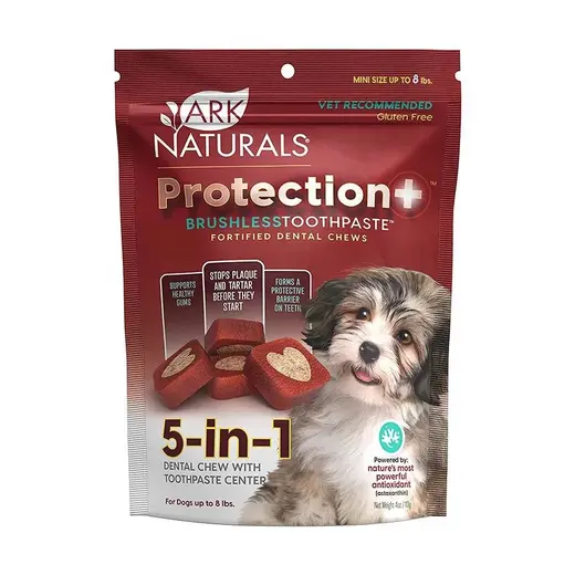 Protection+™ Brushless Toothpaste is the only dental chew that stops plaque and tartar before they start! Powered by nature’s most powerful antioxidant: Astaxanthin! Astaxanthin stops plaque and tartar before it can even start by boosting the antibody immunoglobulin A (lgA) in the saliva, therefore creating a protective barrier on teeth! Ark Naturals unique 5-in-1 dental chews have a toothpaste center with active ingredients and natural breath fresheners such as cinnamon, clove and vanilla. Their dental chews also support gums with antioxidant power and form a protective barrier to support healthy teeth.